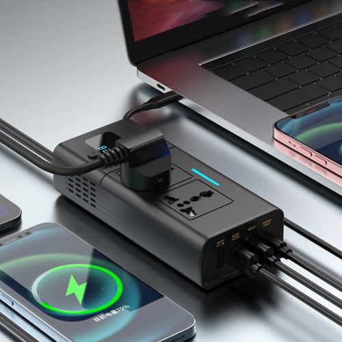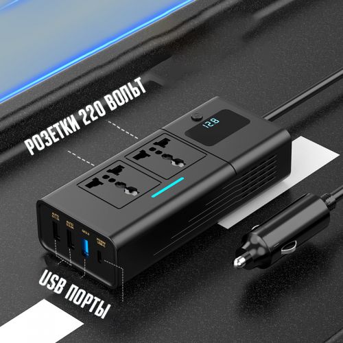 Инвертор автомобильный (преобразователь) с 12В/24В на 220В Power Inverter YK-7922 4USB+TypeC - оснащен мощностью 200 Вт, поэтому может одновременно питать несколько устройств.