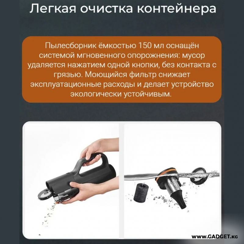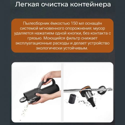 Пылесос оснащен удобной конструкцией для быстрой и гигиеничной очистки пылесборника с помощью нажатия всего одной кнопки, что предотвращает контакт рук с накопившейся грязью. Дополнительно предусмотрена возможность мытья компонентов фильтра, обеспечивающая чистоту и простоту ухода за устройством. Такая конструкция значительно упрощает эксплуатацию пылесоса, делая его использование удобным и эффективным решением для повседневной уборки.