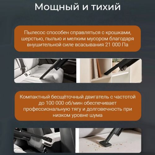 Пылесос оснащен высокоэффективным бесщеточным двигателем, обеспечивающим мощность всасывания в 21 000 Па. Он эффективно справляется с широким спектром загрязнений, включая мелкодисперсную пыль, пищевые крошки и шерсть домашних животных. Высокопроизводительный двигатель, достигающий частоты вращения до 100 000 об/мин, гарантирует стабильную мощность и высокую эффективность вакуумной уборки.Благодаря этому уборка становится легкой и комфортной.