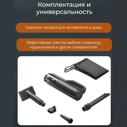 Комплект поставки включает ряд сменных насадок, предназначенных как для автомобильной, так и для бытовой уборки. Mijia Car Vacuum Cleaner с лёгкостью справляется с чисткой мягкой мебели, клавиатур, подоконников и других поверхностей. Его эргономика, лёгкость и технологическая база делают его универсальным союзником в поддержании чистоты.