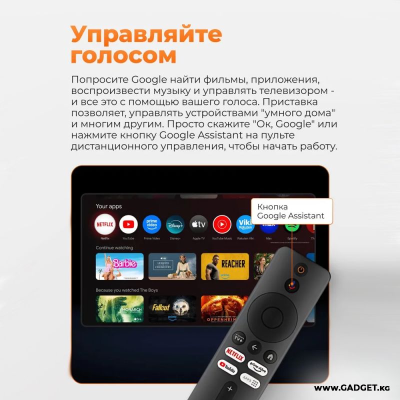 Управляйте телевизором и приставкой с помощью Google Assistant. Запускайте потоковые приложения, воспроизводите музыку и управляйте устройствами умного дома голосом. Bluetooth-пульт обеспечивает полный контроль под любым углом, а поиск по голосу делает управление быстрым и удобным.