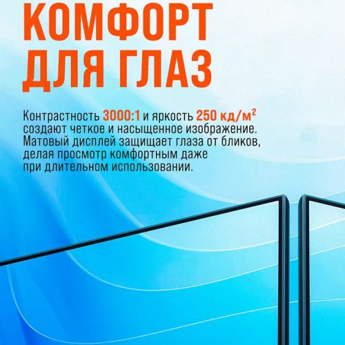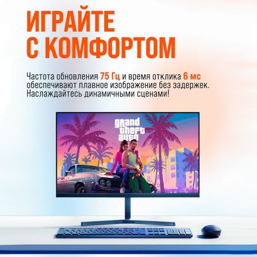 Матрица VA и контрастность 3000:1 обеспечивают глубокий черный цвет и четкие детали. Частота обновления 75 Гц делает изображение плавным, что особенно важно для игр и просмотра видео. Матовое покрытие экрана исключает блики, сохраняя комфорт для глаз даже при длительной работе.
