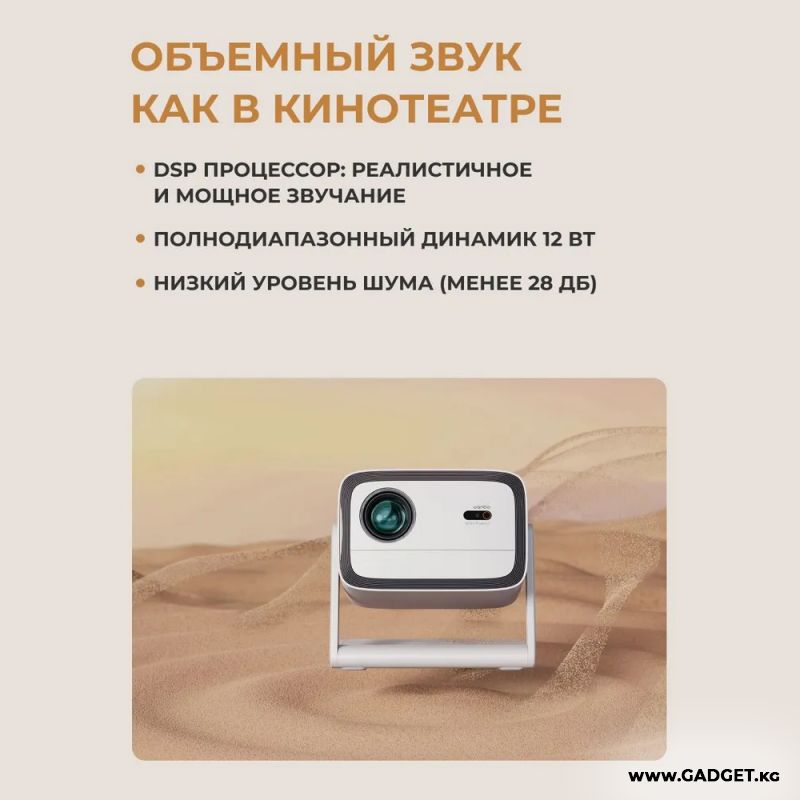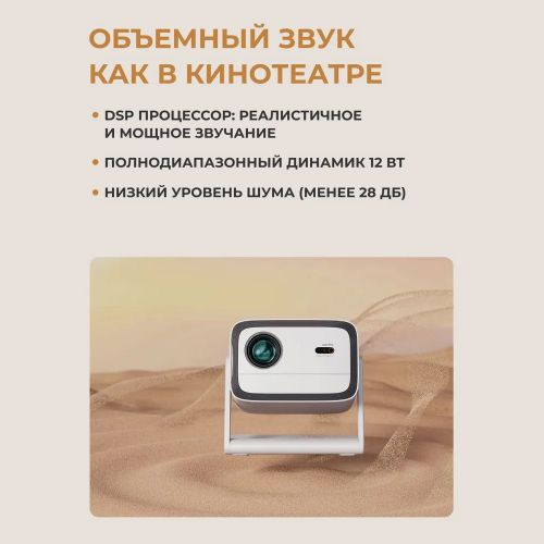 В корпус встроены два динамика мощностью по 6 Вт, расположенные в специальной акустической камере объемом 500cc. Благодаря этому звук достаточно громкий и чистый, а бас ощутимый даже без подключения дополнительных колонок. У проектора есть несколько режимов воспроизведения — «Фильм», «Музыка», «Игры», которые настраивают звучание в соответствии с контентом. В небольших комнатах этого аудио хватает для полного погружения, а для более масштабных мер можно подключить внешнюю акустику через Bluetooth или аудиовыход 3,5 мм.