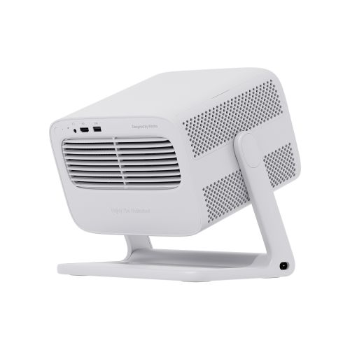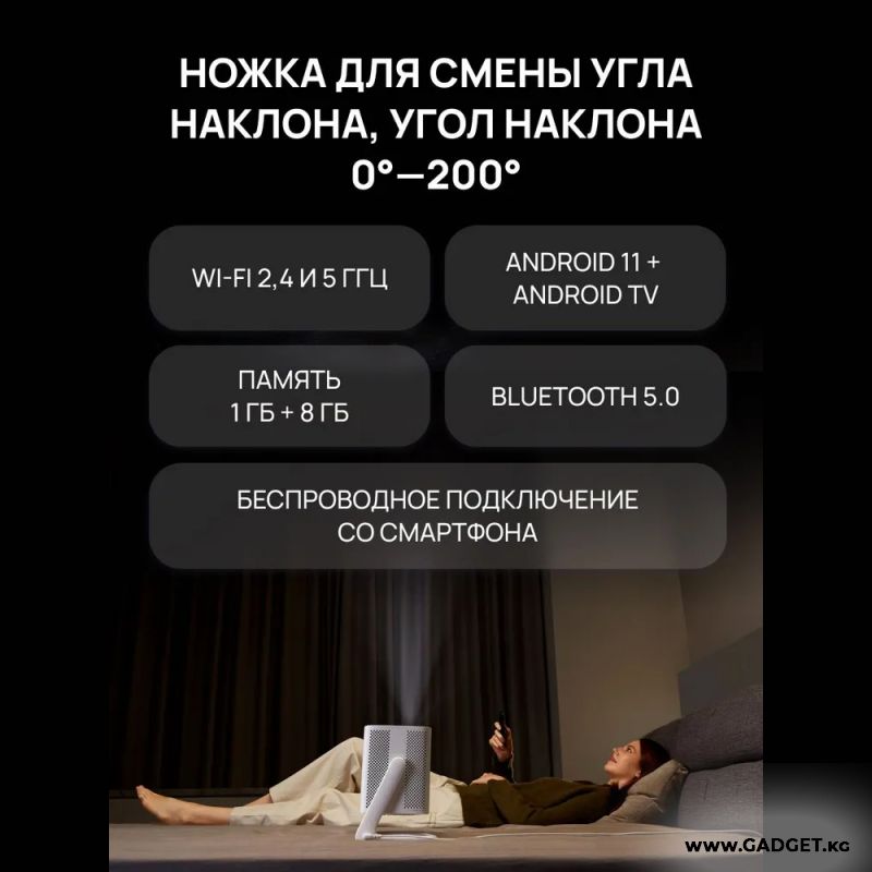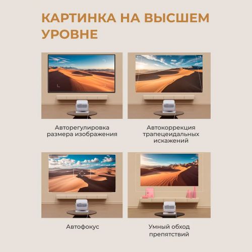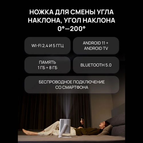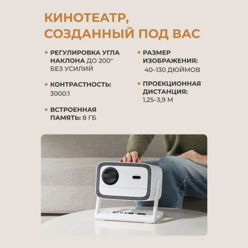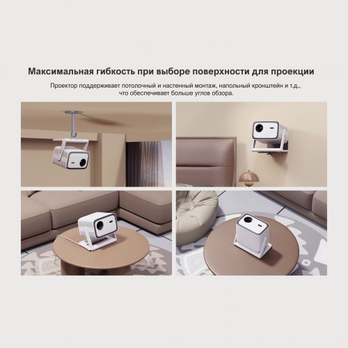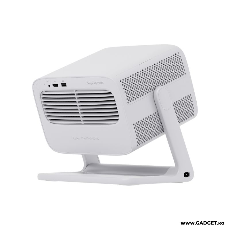 Проектор имеет габариты 254 × 188,8 × 227,6 мм и весит около 2,8 кг. Благодаря стильному минималистичному дизайну в белом цвете он выглядит современно и легко вписывается в интерьер гостиной или спальни. Подставка-гимбал с углом поворота 200° предоставляет максимальную гибкость в выборе поверхности для проекции: можно транслировать изображение на стену, экран или даже потолок. В комплекте предусмотрен резиновый колпачок для защиты объектива, запасной пылевой фильтр и отсек для хранения пульта.