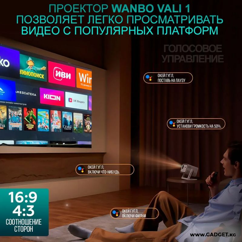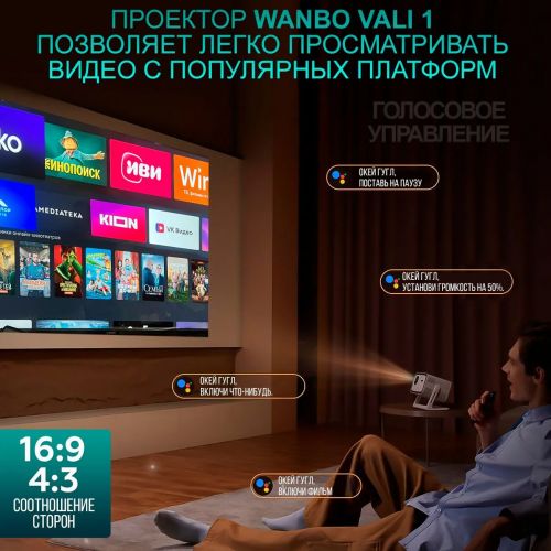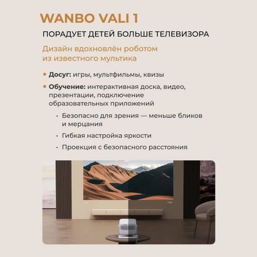 Wanbo Vali 1 — это сбалансированный Full HD проектор, который предлагает хорошее сочетание цены, функционала и дизайна. Его сильные стороны — автоматические настройки, удобная подставка-гимбал, Android TV с поддержкой популярных сервисов и качественный встроенный звук.