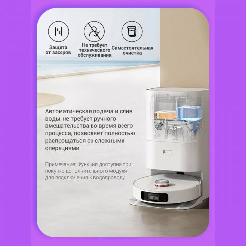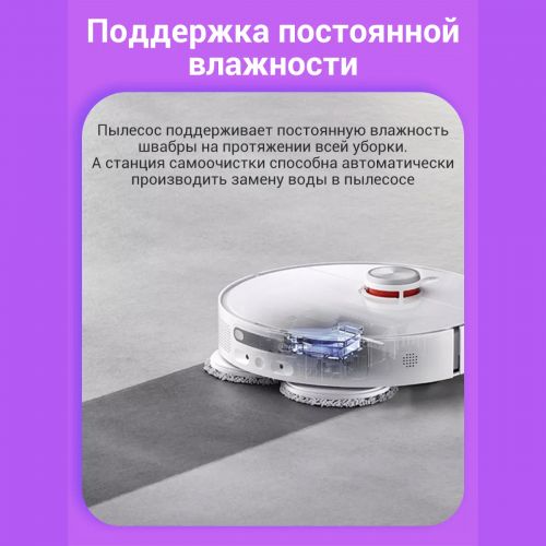 У пылесоса есть резервуар для воды объемом 80 мл, который поддерживает влажность салфеток в процессе уборки. Этот резервуар автоматически заправляется на док-станции из бака с чистой водой. В резервуар можно добавлять чистящие и дезинфицирующие средства для повышения эффективности влажной уборки.