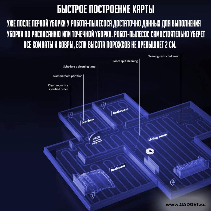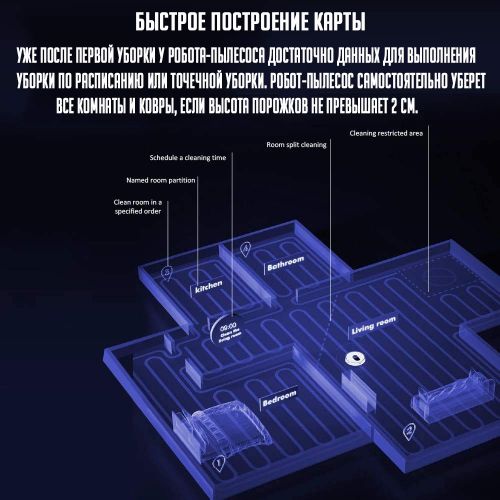 Уже после первой уборки у робота-пылесоса достаточно данных для выполнения уборки по расписанию или точечной уборки. Робот-пылесос самостоятельно уберет все комнаты и ковры, если высота порожков не превышает 2 см.