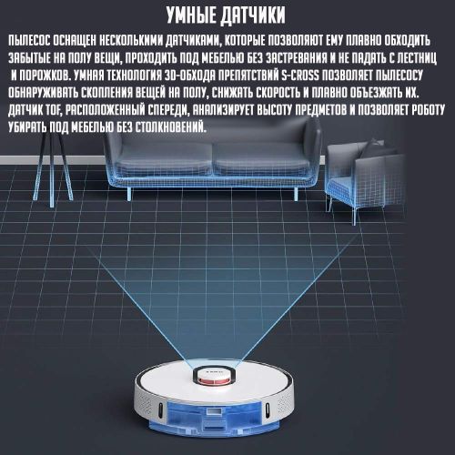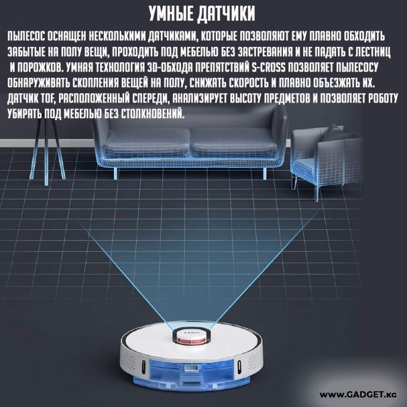 Пылесос оснащен несколькими датчиками, которые позволяют ему плавно обходить забытые на полу вещи, проходить под мебелью без застревания и не падать с лестниц и порожков. Умная технология 3D-обхода препятствий S-cross позволяет пылесосу обнаруживать скопления вещей на полу, снижать скорость и плавно объезжать их. Датчик TOF, расположенный спереди, анализирует высоту предметов и позволяет роботу убирать под мебелью без столкновений.