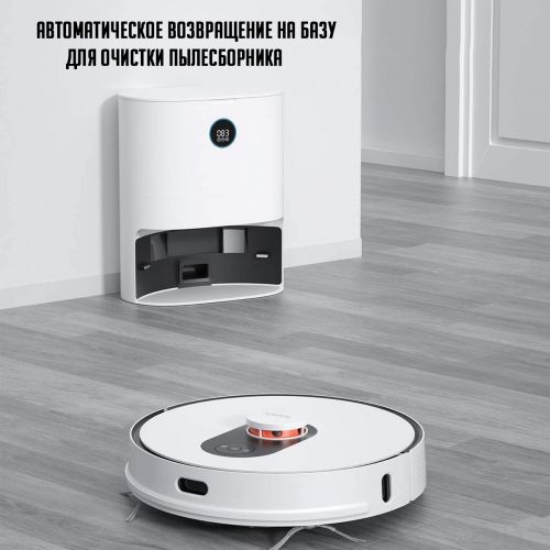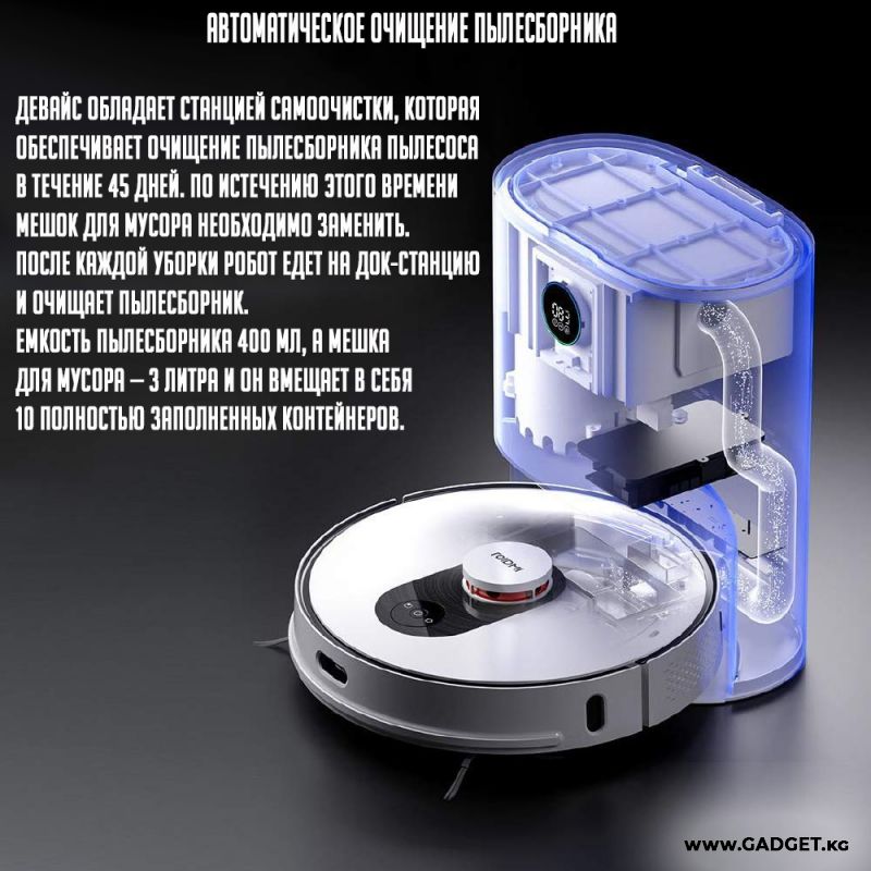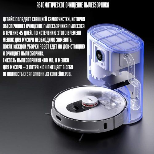 Девайс обладает станцией самоочистки, которая обеспечивает очищение пылесборника пылесоса в течение 45 дней. По истечению этого времени мешок для мусора необходимо заменить.