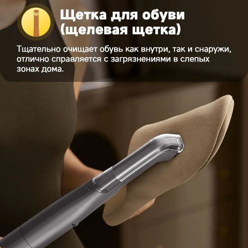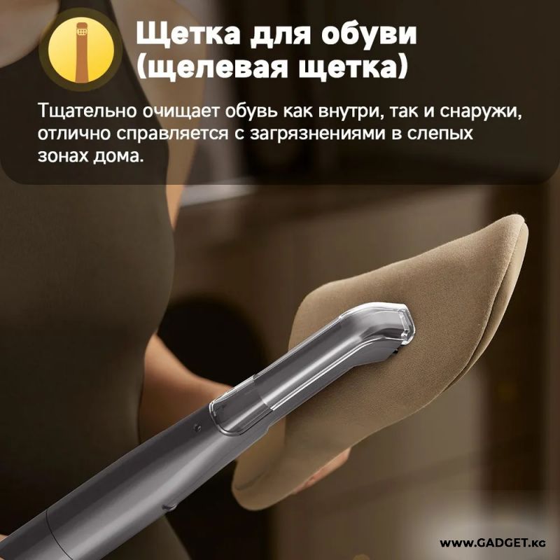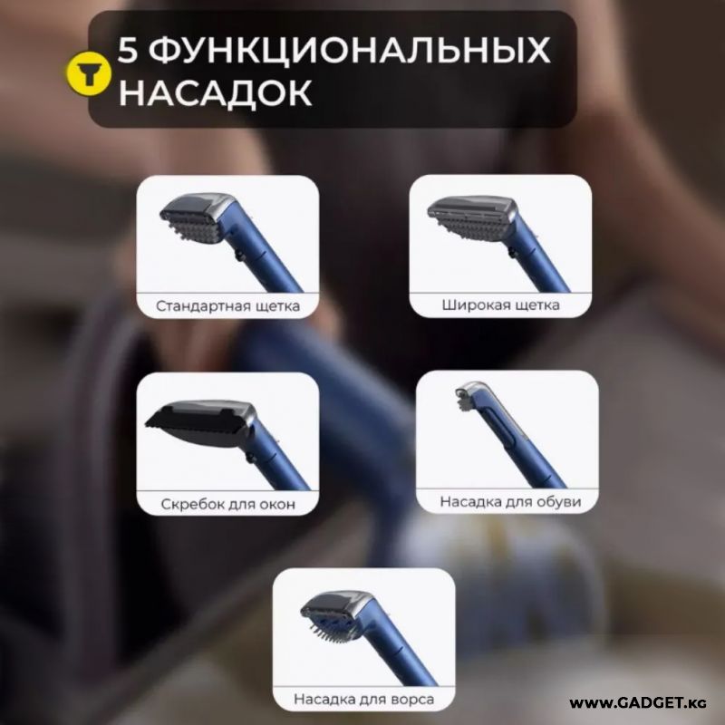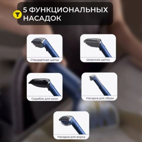 В комплекте 5 насадок для очистки всего дома: стандартная насадка, широкая зубчатая насадка, скребок для окон, насадка для обуви, насадка для ворса.