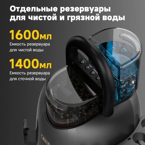 Пылесос обладает 2 резервуарами для воды 1,4 и 1,6 л. Один предназначен для чистой воды, в другой сливается вода после уборки. Разделение потоков воды предотвращает вторичное загрязнение и обратный отток.