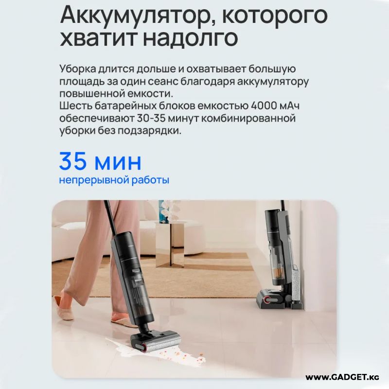 Уборка длится дольше и охватывает большую площадь за один сеанс благодаря аккумулятору повышенной емкости. 6 батарейных блоков емкостью 4000 мАч каждый обеспечивают более получаса комбинированной уборки без подзарядки.