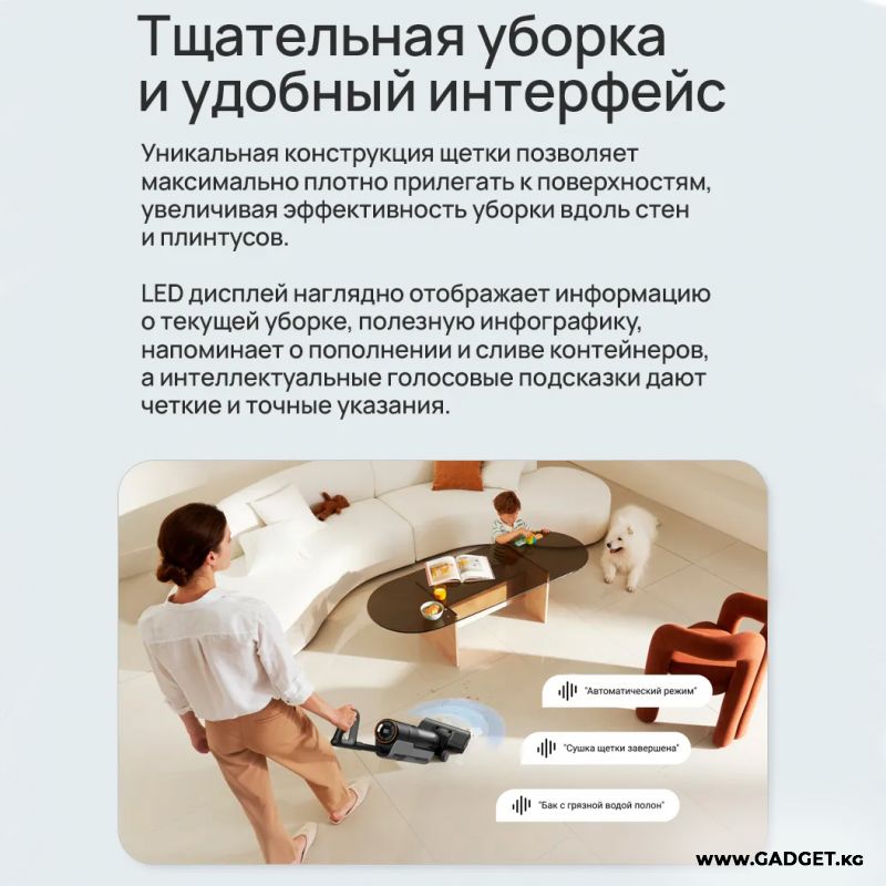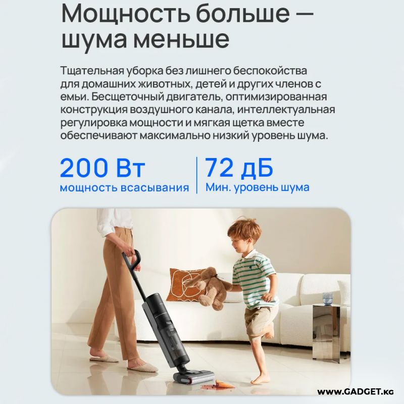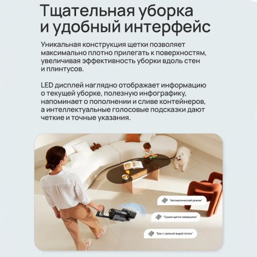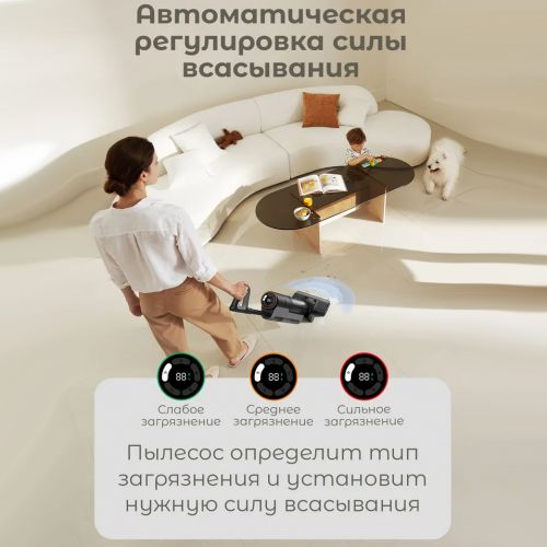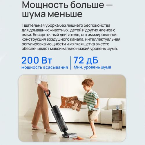 Тщательная уборка без лишнего беспокойства для домашних животных, детей и других членов семьи. Бесщеточный двигатель, оптимизированная конструкция воздушного канала, интеллектуальная регулировка мощности и мягкая щетка вместе обеспечивают максимально низкий уровень шума.