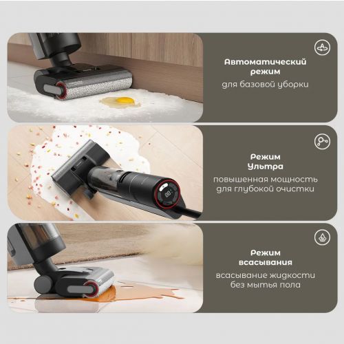 Свободно переключайтесь между режимами в зависимости от характера беспорядка. С повседневными задачами прекрасно справится стандартный режим, ультра-режим рассчитан на сложные, устойчивые загрязнения, а режима всасывания — на случаи, когда во влажной уборке нет необходимости.