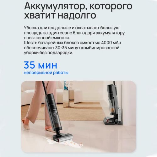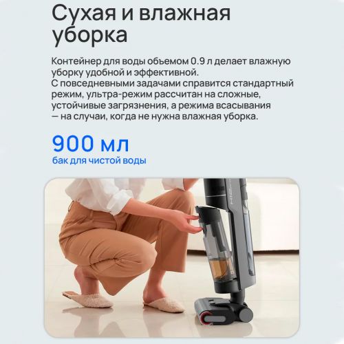 Dreame H12 Pro автоматически распознает степень загрязнения и реагирует соответствующим образом, обеспечивая оптимальные расход энергии аккумулятора и эффективность уборки.
