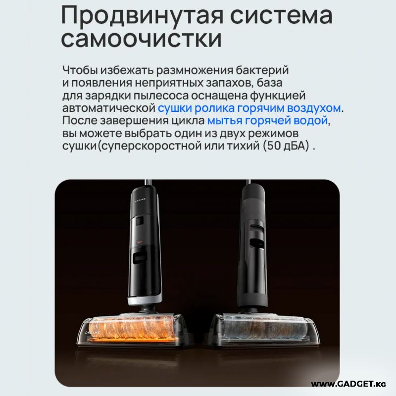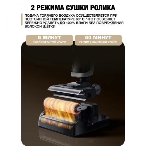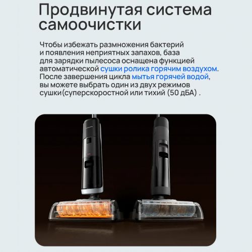 Влажная среда - идеальная почва для размножения бактерий и появления неприятных запахов. Чтобы этого избежать, база для зарядки пылесоса оснащена функцией автоматической сушки ролика горячим воздухом. После завершения цикла мытья горячей водой, вы можете выбрать один из двух режимов сушки.