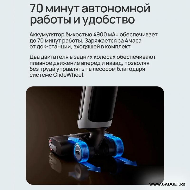 Два двигателя в задних колесах обеспечивают плавное движение вперед и назад, позволяя без труда управлять пылесосом.