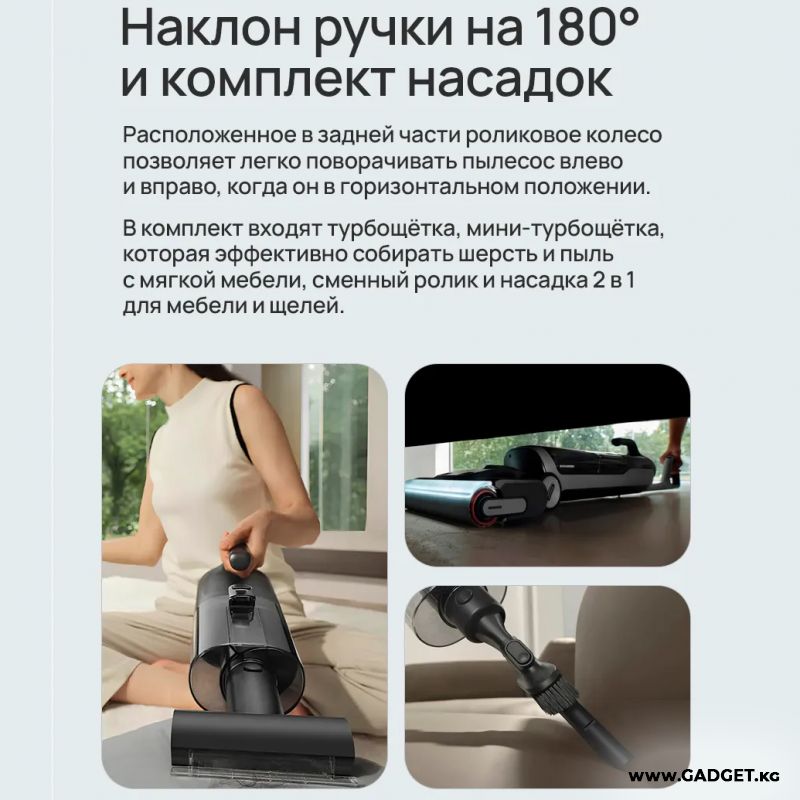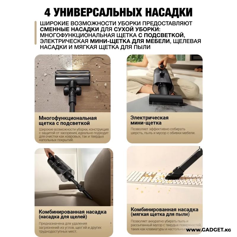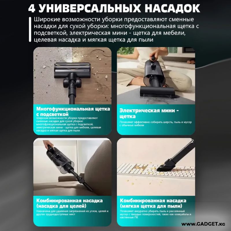 В комплект входят универсальная турбощетка с подсветкой, мини-щетка, комбинированные щелевая насадка для пыли, система для влажной уборки.