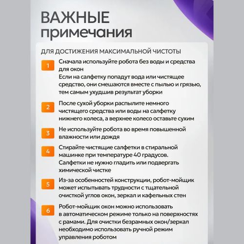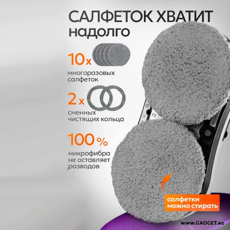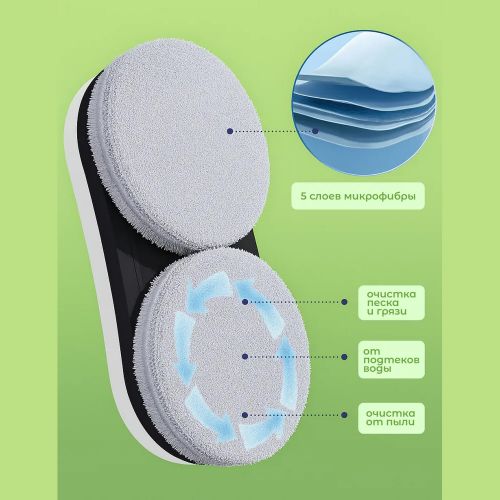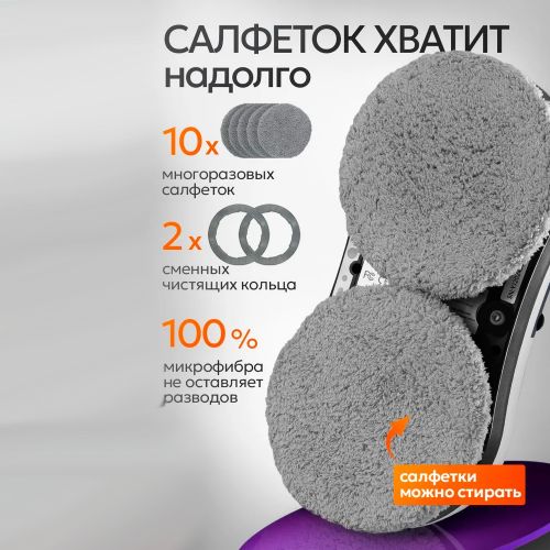 Принцип работы прост: робот оснащен специальными дисками, которые имитируют движения руки и снабжены сменными салфетками из микрофибры. Эти салфетки эффективно удаляют все виды пятен, не оставляя разводов и царапин, и легко очищаются. В комплект входят 10 салфеток, и вы можете добавлять чистящие средства по мере необходимости, чтобы улучшить результат.