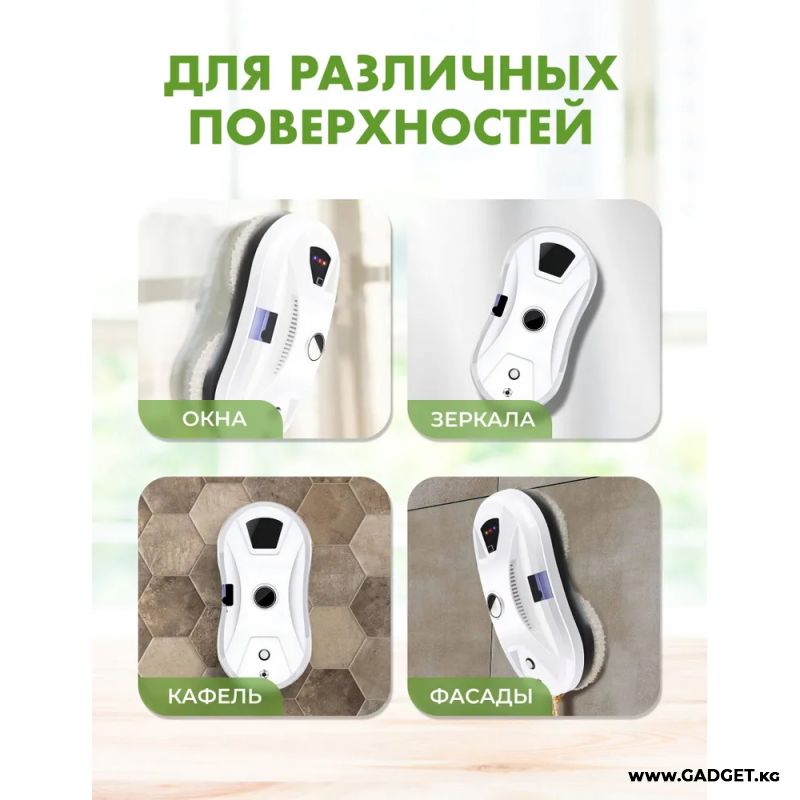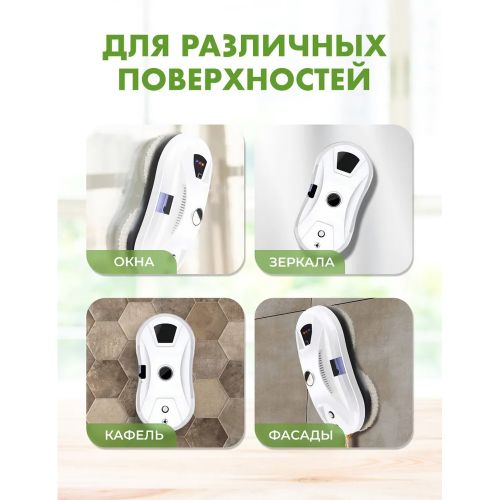 Его функциональное устройство позволяет свободно в автоматическом режиме перемещаться по гладкому пространству, мыть стекла, плитки, окна и пластиковые фасады, эффективно очищая их от скопившихся загрязнений и разводов с двух сторон.