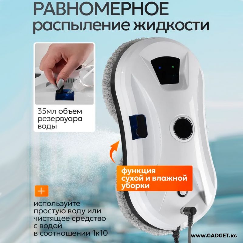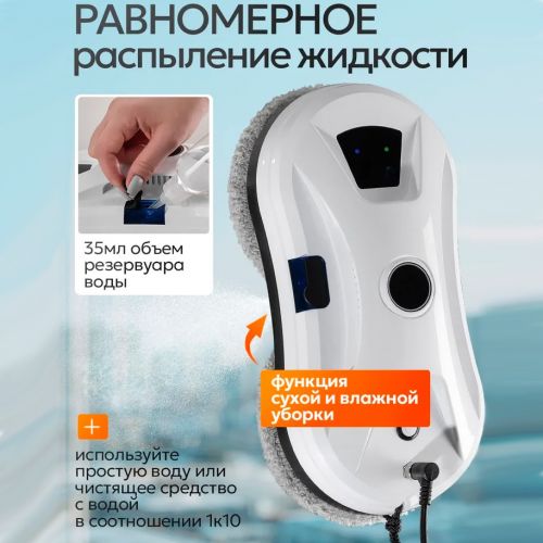 Робот-мойщик окон имеет распыление воды, которое помогает удалить загрязнения с поверхности окон. Это особенно полезно в жаркую погоду или когда на улице много пыли. Резервуар вмещает 35 мл воды. Воспользоваться распылением можно при помощи пульта дистанционного управления.