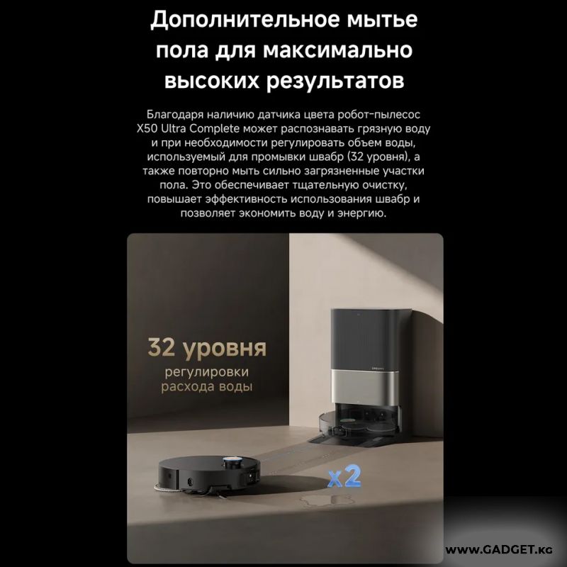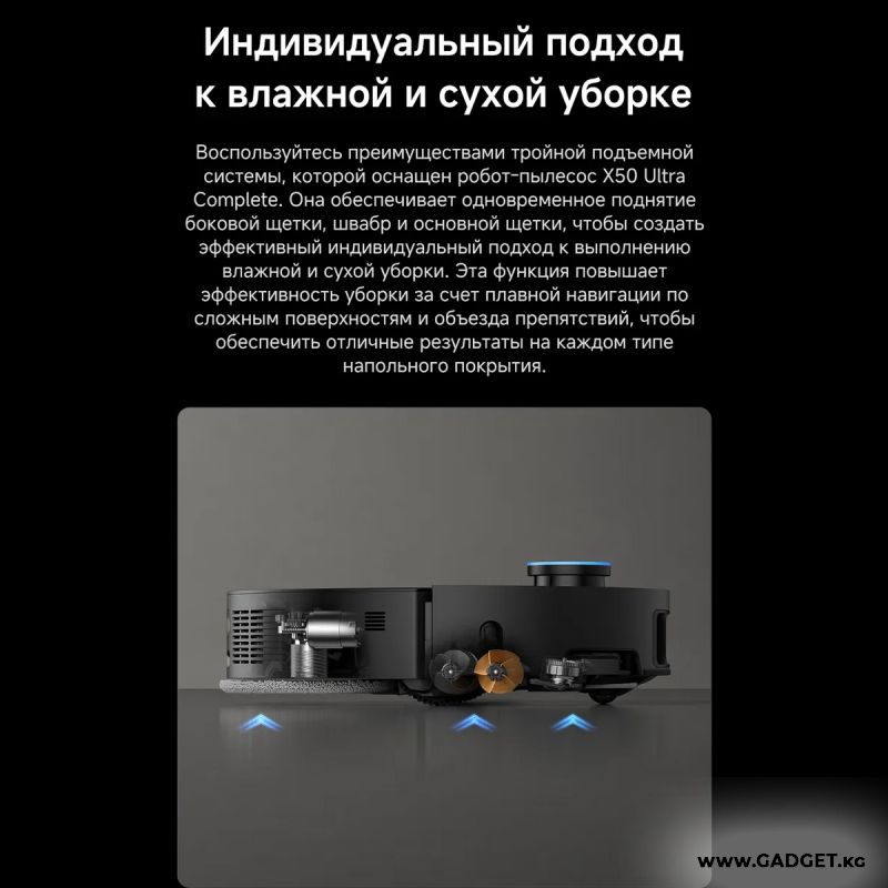 Воспользуйтесь преимуществами тройной подъемной системы, которой оснащен робот-пылесос X50 Ultra Complete. Она обеспечивает одновременное поднятие боковой щетки, швабр и основной щетки, чтобы создать эффективный индивидуальный подход к выполнению влажной и сухой уборки. Эта функция повышает эффективность уборки за счет плавной навигации по сложным поверхностям и объезда препятствий, чтобы обеспечить отличные результаты на каждом типе напольного покрытия.
