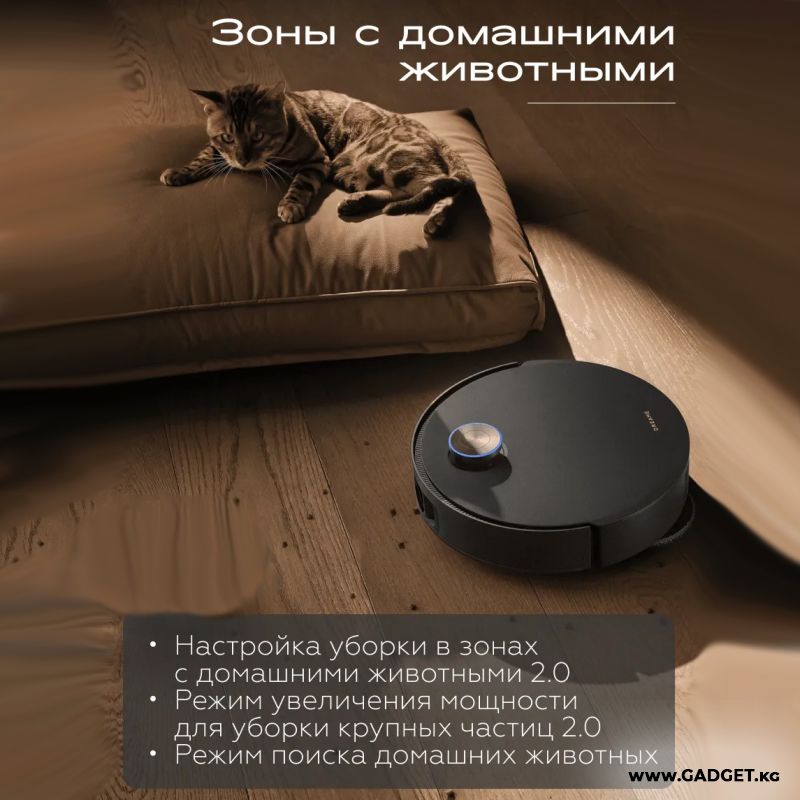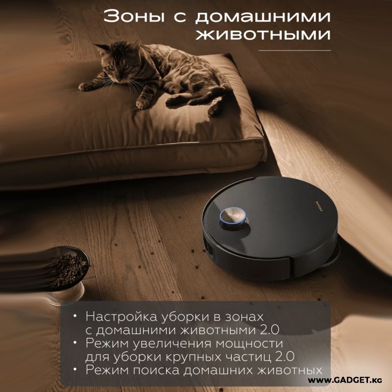 Избавьте себя от хлопот с помощью функции настройки уборки в зонах с домашними животными 2.0, функции динамической локальной уборки и режима увеличения мощности для уборки крупных частиц, которые помогут поддерживать безупречную чистоту в вашем доме и создать комфортные условия для ваших питомцев.