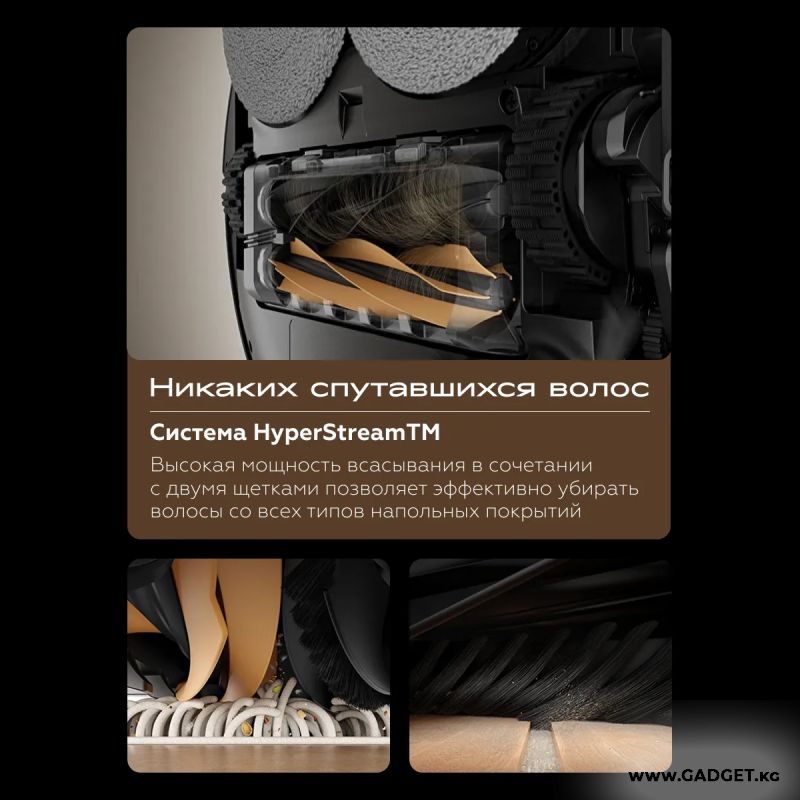 Система HyperStreamTM с двумя щетками разработана для 100% уборки спутавшихся волос. Она без труда справляется с прядями длиной до 30 см. Высокая мощность всасывания в сочетании с резиновой щеткой со щетиной и резиновой щеткой из термопластичного полиуретана позволяет эффективно убирать волосы со всех типов напольных покрытий с минимальным уровнем шума, обеспечивая тщательную и тихую уборку во время каждого сеанса.