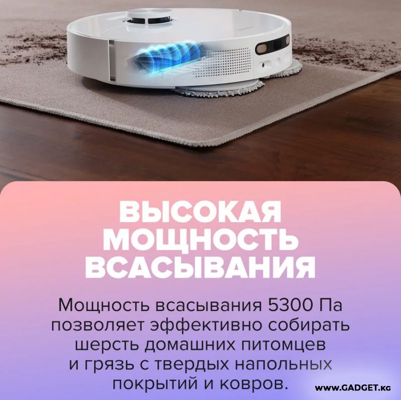 Новшеством в данной модели является функция подъема салфеток, при заезде на ковер, и преодолении порогов. Что позволяет роботу без проблем одновременно мыть пол и пылесосить на коврах, да еще и как, с мощностью всасывания 5300 Па.