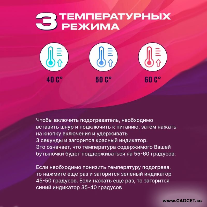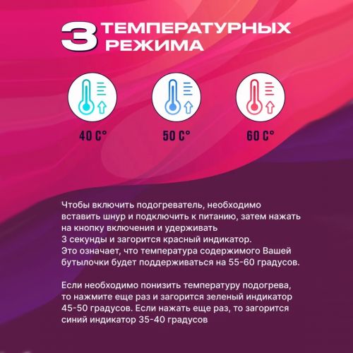 С помощью специальной кнопки вы легко сможете настроить точную температуру подогрева. Подогреватель подходит почти для всех размеров бутылочек, что делает его универсальным решением для вашего ребенка.