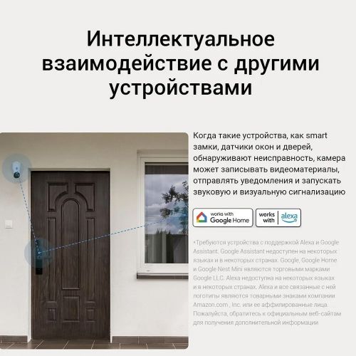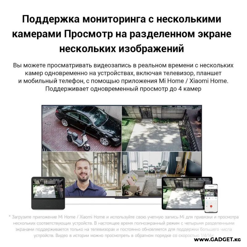 В случае, если датчики открытой двери или окон обнаруживают опасность, они могут взаимодействовать с камерой, чтобы записать видео и отправить уведомление вам. Камера также может активировать звуковой и визуальный сигнал тревоги. В приложении Mi Home/Xiaomi Home вы сможете объединить работу до 4 камер и следить за территорией, просматривая на экране видео с 4 камер одновременно.