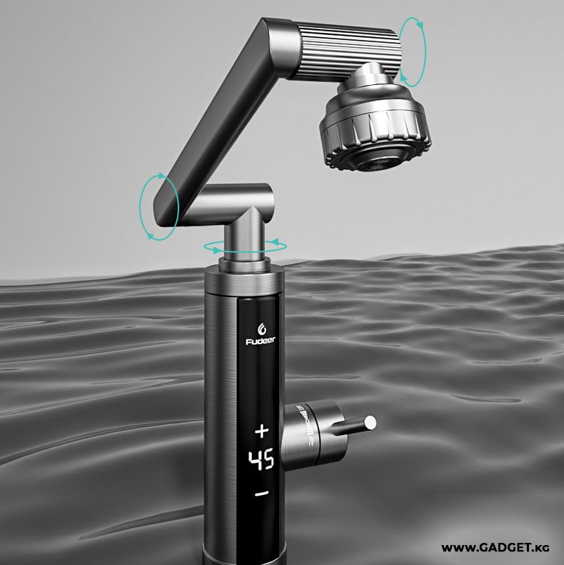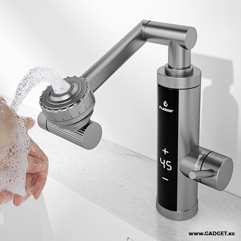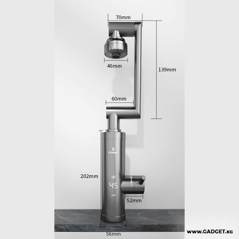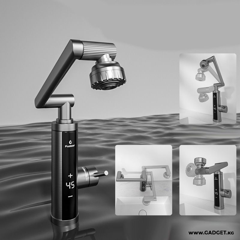 В корпусе крана для нагрева воды спрятан нагревательный элемент и кабель питания. Вода поступает по спирали и начинает вытекать примерно через 5-10 секунд после включения аппарата. За это время она достигает нужной температуры. Для регулировки напора и температуры на корпусе изделия есть специальная ручка. Непосредственно под корпусом располагается переключатель и лампочка-индикатор. К водопроводной трубе устройство присоединяется специальным винтом, и дополнительно фиксируется под раковиной муфтой.