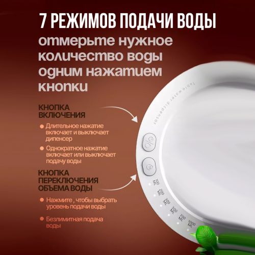 Электрическая помпа обладает семью кнопками с разным объемом подачи воды, что позволяет вам выбрать удобный объем. Этот диспенсер для воды сделает процесс подачи воды простым и быстрым. Эта электропомпа работает очень тихо, поэтому она не будет мешать вам или вашим близким во время использования.