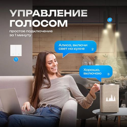 Белый цвет и стильный дизайн позволяют гармонично вписаться в любой интерьер. Включайте свет легко: нажатием на кнопку с подсветкой, дистанционно с приложениями Smart Life или голосом с Яндекс Алисой, которая управляет каждой группой света отдельно и добавляет их в сценарии системы.