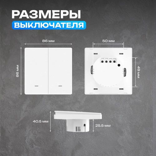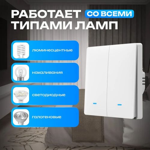 Умный двухклавишный выключатель Wi-Fi - инновационное устройство, которое преобразит вашу жизнь и сделает управление освещением в доме намного удобнее и эффективнее. Идеальное решение для всех, кто хочет сделать домашнюю обстановку еще комфортнее. Настенное оборудование работает не только от механического нажатия на клавишу, но и по Wi-Fi через приложение или через систему умного дома от Яндекс для бесконтактного включения и отключения.