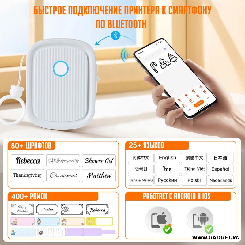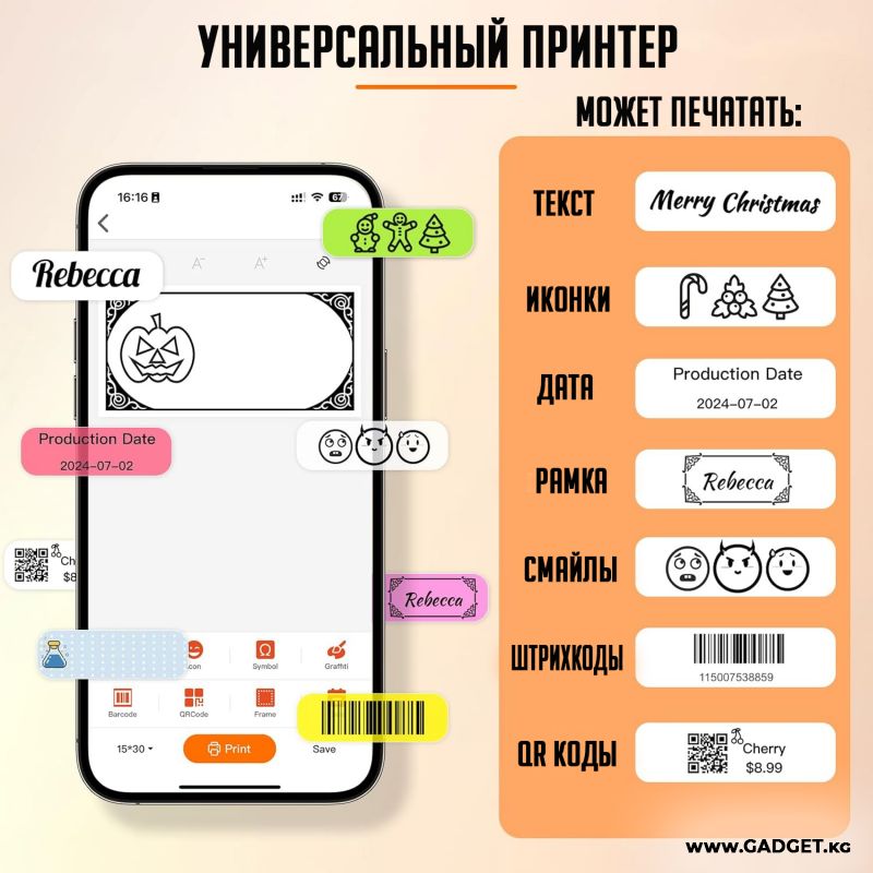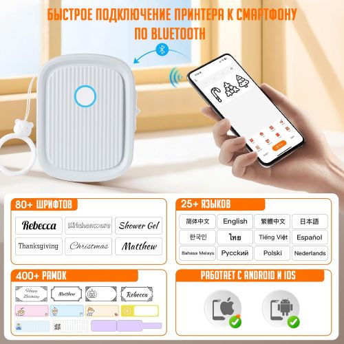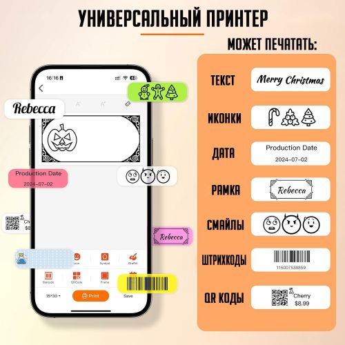 Этот принтер использует мобильное приложение для редактирования, вы можете настроить печать, включая текст, маленькое изображение, дату, рамку, наклейку, линию, значок, QR-код, штрих-код, граффити, серийный номер. Множество различных вариантов шрифтов, свободно регулируйте размер и положение. Можно использовать ленты с милыми этикетками в нескольких стилях. Принтер может использовать ленты различных стилей, такие как белые, цветные и тд. Эта лента долговечна, водонепроницаема, устойчива к разрыву.