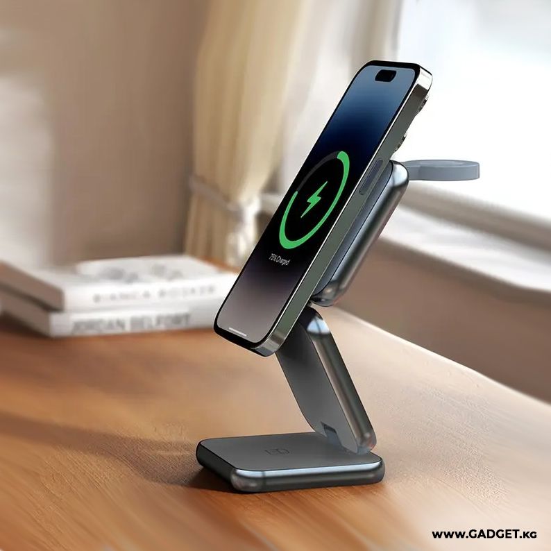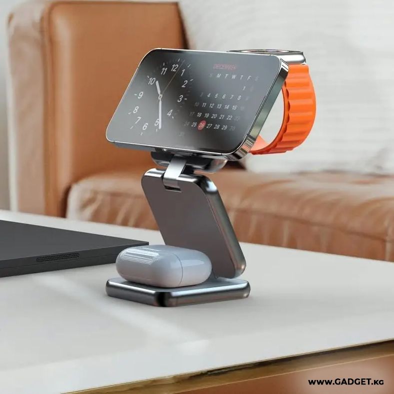 Зарядная станция 3в1 Wireless Charger позволяет заряжать три подключенных девайса одновременно - смартфон с поддержкой беспроводной зарядки, смарт часы Apple Watch и кейс для AirPods. Также она поддерживает возможность быстрой зарядки смартфона, и обладает электронным открывающимся механизком. Выгодно отличается качественными материалами, стильным дизайном, прочностью и простотой установки.