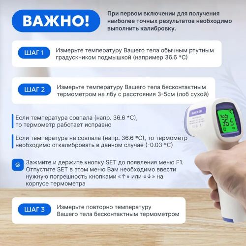 Для точного и правильного измерения температуры замер необходимо производить на расстояние 5 – 10 см от лба. Если бесконтактный термометр показывает с отклонение от ртутного градусника, то его можно легко откалибровать. К примеру, если ртутный термометр показывает температуру «36,6», а бесконтактный термометр «37,0», следует перейти в режим f3 и выставить значение «-0,4».