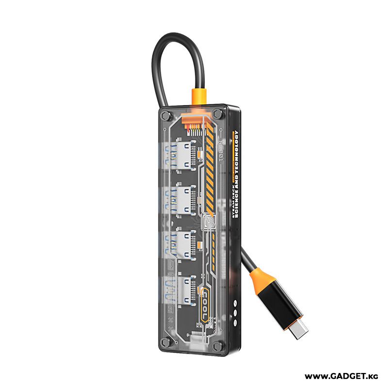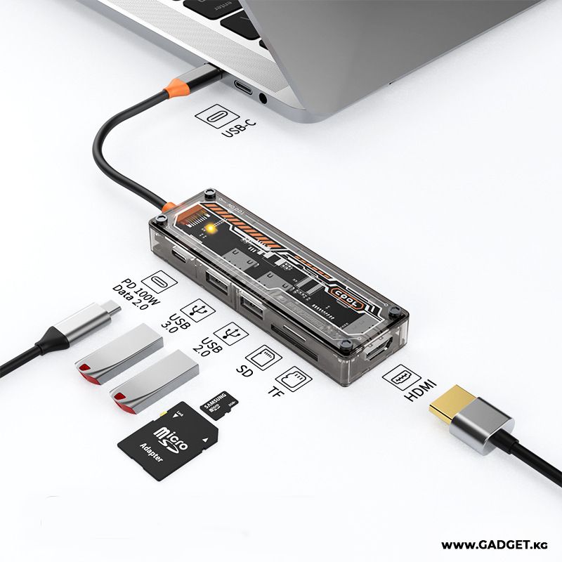 Адаптер Hub Type-C - это разветвитель предназначенный для подключения одновременно 6 устройств в один Type-C порт на вашем ПК или ноутбуке. Передача данных происходит практически без потери скорости. Прочный корпус, толстый и надежный кабель. Этот аксессуар прослужит вам много лет, не сомневайтесь.
