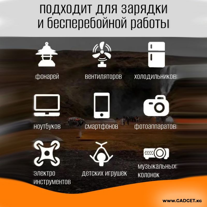 Зарядка и питание мобильных девайсов происходит с помощью 2 USB портов. А для питания бытовой техники портативный аккумулятор оснащен розеткой 220 вольт. Таким образом вы можете заряжать любую технику телефон, планшет, вентилятор, телевизор, ноутбук, компьютер, портативный холодильник, освещение и т.д.