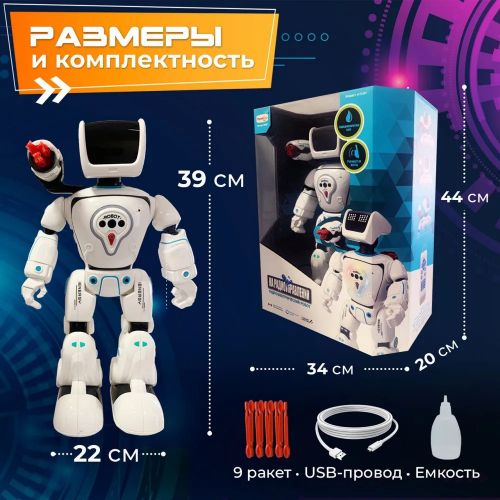 Высота робота – 38 см. Он очень подвижный и гибкий, благодаря двигающимся суставам. Он имеет световые и звуковые эффекты. На ступнях у него находятся по четыре колесика, что позволяет выполнять ему движения в разных плоскостях, любой сложности. Ребенок будет в восторге от такой потрясающей игрушки и его способностей. В комплект входят робот, пульт управления, USB-зарядка для аккумулятора, бутылочка для воды, стрелы-снаряды для оружия и инструкция на русском языке.