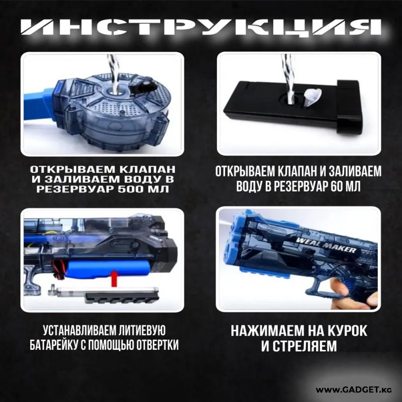 Небольшой корпус и большая вместимость — главные особенности этого водяного пистолета. Есть 2 варианта резервуаров для воды - 500 мл и 50 мл. Во время игры можно быстро сменить резервуары, если вода в одном из них закончилась, и продолжить. В сумме можно сделать до 500 выстрелов! Пистолет удобный в руке, имеет нескользящую ручку, поэтому его легко использовать. Выстрел производится одним нажатием кнопки. Дальность выстрела - 10-12 метров.