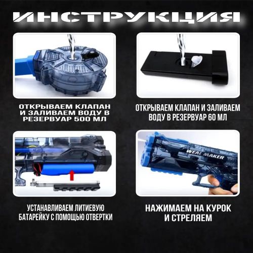 Водяной пистолет Electric Water Gun - замечательная качественная игрушка для летних игр, со вместительным магазином и длительным временем работы. Корпус изготовлен из высококачественного ABS-пластика, в соответствии со стандартами качества игрушек. Батарея электрического водяного пистолета поддерживает зарядку через USB и обеспечивает до 4 часов автономной работы. Время зарядки батареи - 2 часа.