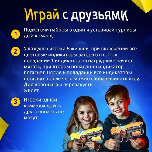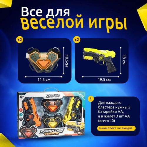 Хотите получить море положительных эмоций? Берите игрушечный бластер, одевайте жилет - базу и занимайте самую лучшую позицию, ведь соперник уже совсем близко и битва будет жаркой! Полноценный интерактивный набор для лазертага для 2 игроков, впечатлит всех ребят, даже взрослым будет интересно поучаствовать в баталии.