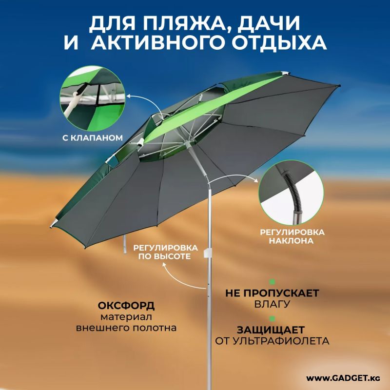 - Максимальная высота 222 см: Высокий зонт создает обширную теневую зону, под которой удобно разместиться всей семьей или компанией друзей, обеспечивая комфортное пребывание на открытом воздухе.
