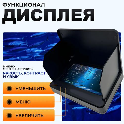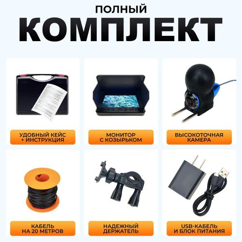 В набор с камерой входят: удобный монитор с диагональю 5 дюймов, крепление на удочку, зарядное устройство, надежный 30-метровый провод, водонепроницаемая камера и кабель. Эта видеокамера идеально подходит для наблюдения за подводной жизнью, предлагая высокое разрешение, которое обеспечивает качественную видеосъемку на глубинах от 0,6 до 30 метров.