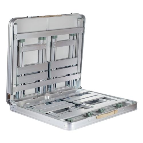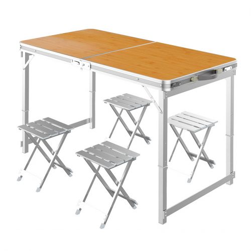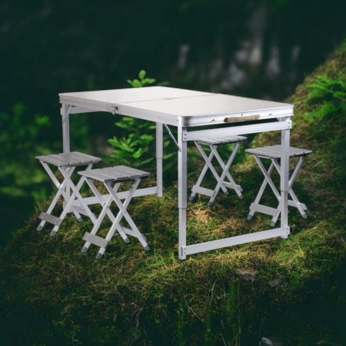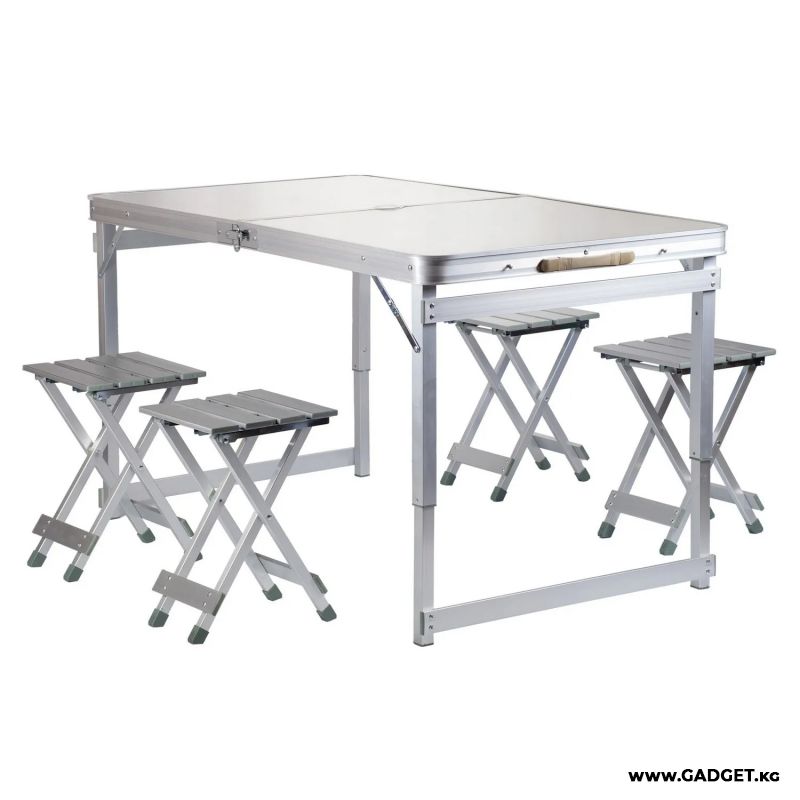 Стол имеет складную конструкцию, благодаря которой он легко складывается и занимает минимум места при транспортировке. В сложенном виде стол представляет собой компактный чемоданчик, внутри которого расположены 4 стула. Это позволяет сэкономить место и удобно переносить весь комплект.