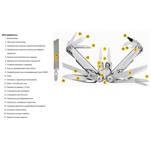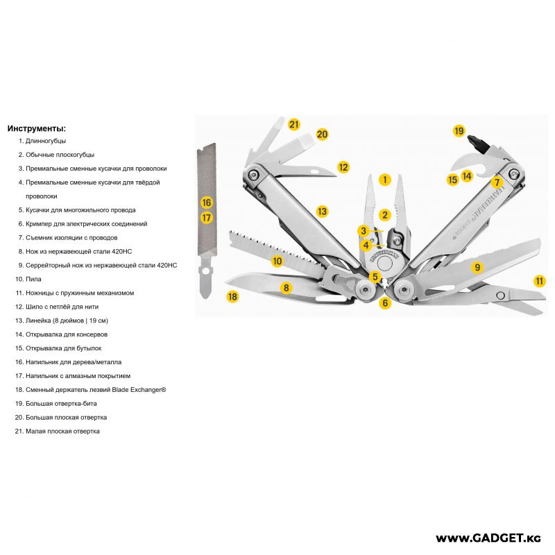 - Многофункциональность: 21 инструмент в одном, включая плоскогубцы, кусачки, ножи, пилы, отвертки, открывалки и многое другое.