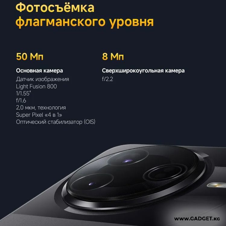 - Основная Камера: 50 Мп + 8 Мп, f/1.6 + f/2.2, Видео 4К UHD (3840x2160)