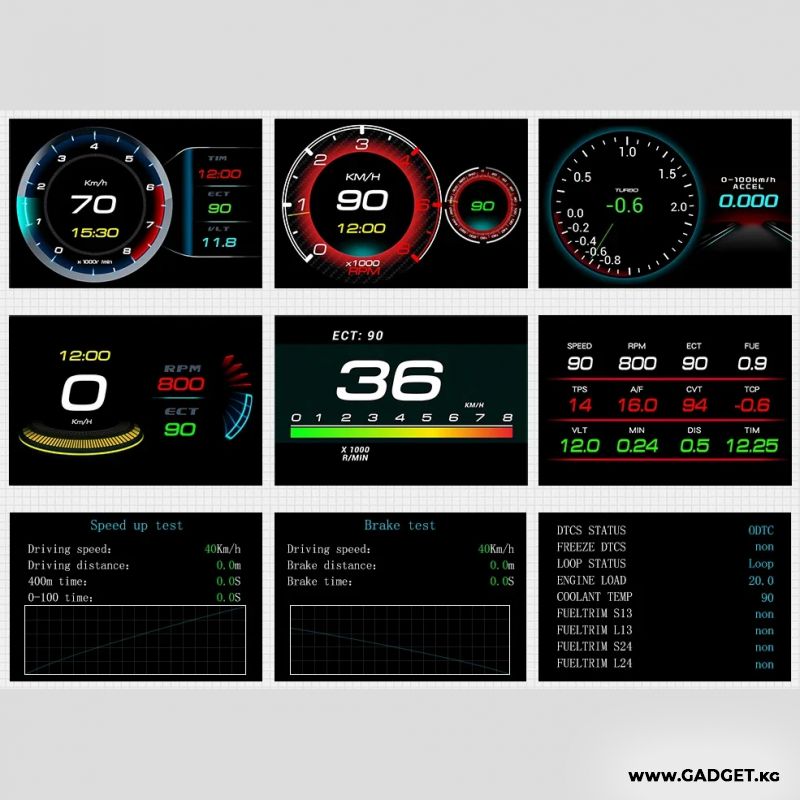 Түзүлүштүн компакттуу өлчөмдөрү орнотууну жеңилдетет жана приборлор панелинде көп орун ээлебейт. OBD 2 Дисплейди айдоодо максималдуу коопсуздукту камсыз кылуу үчүн колдонуңуз, автоунааңыздын негизги параметрлери жөнүндө жолдон көңүл бурууну бөлбөстөн маалыматыңызды сактап туруңуз.